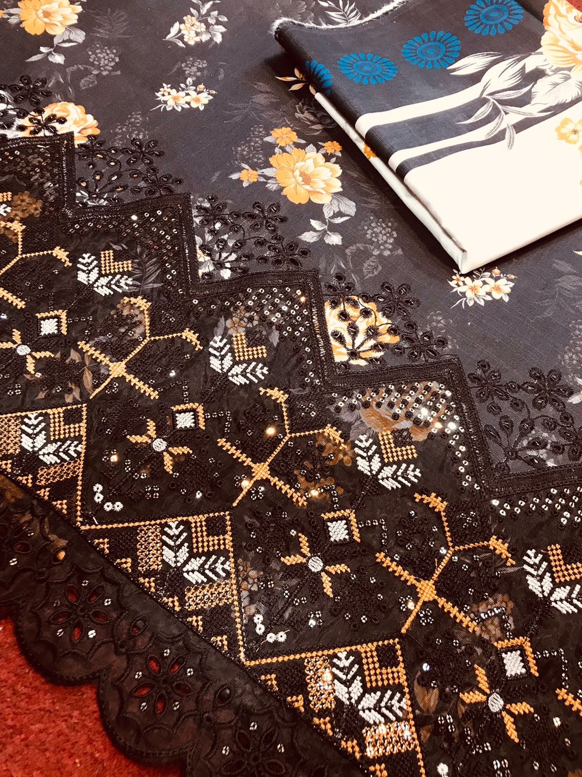 Premium 3-Piece Slub Khaddar Suit – Black Floral Edition (Daman Embroidery & Patchwork Boring)