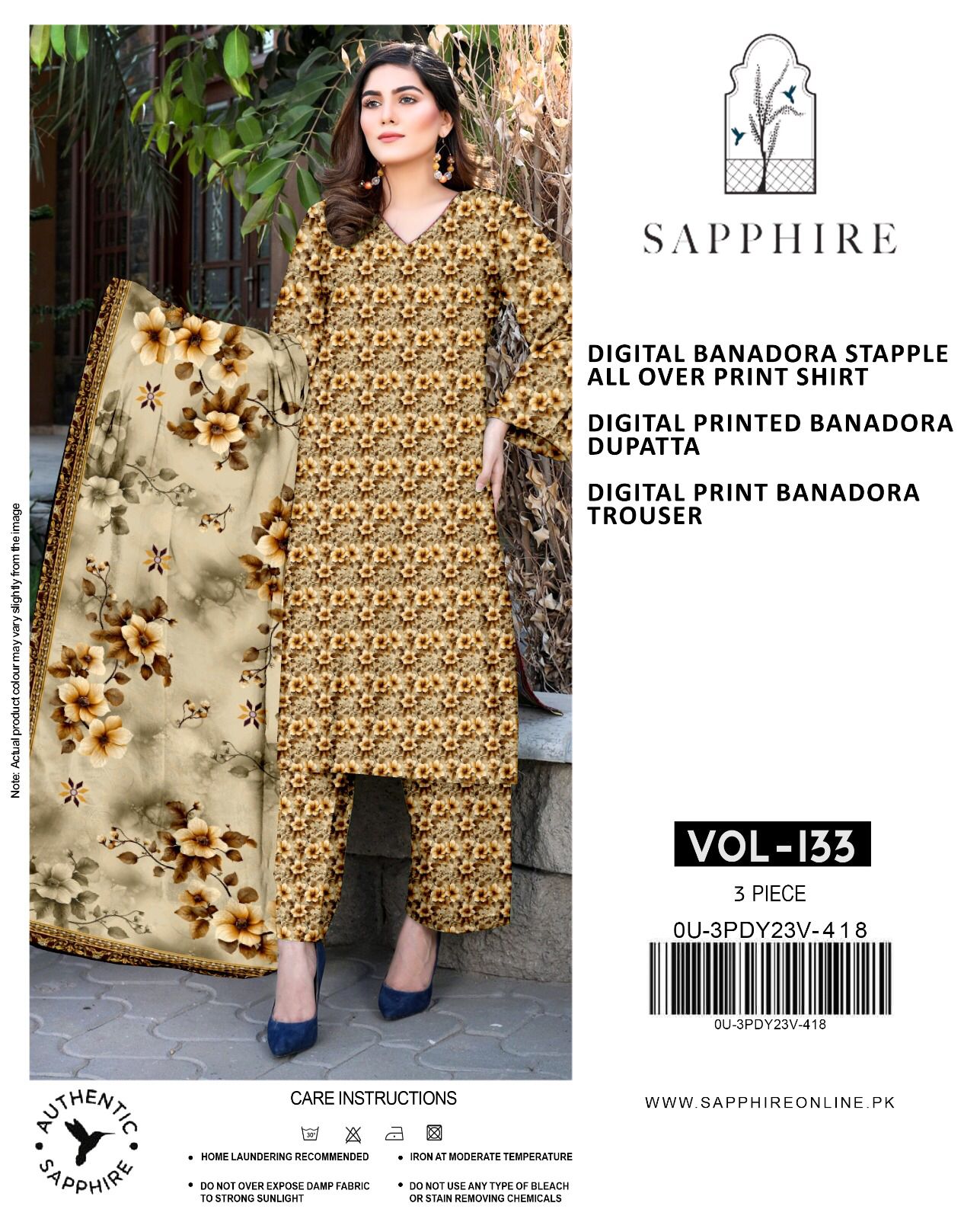 This suit has a dense all-over digital print with vibrant coral, pink, and red flowers set against a deep, rich dark teal/black base. The large-scale floral and circular motifs on the matching Digital Printed Banadora Dupatta give the whole look a high-end, finished feel. This is an unstitched set, meaning you get the maximum value and control over your final design.