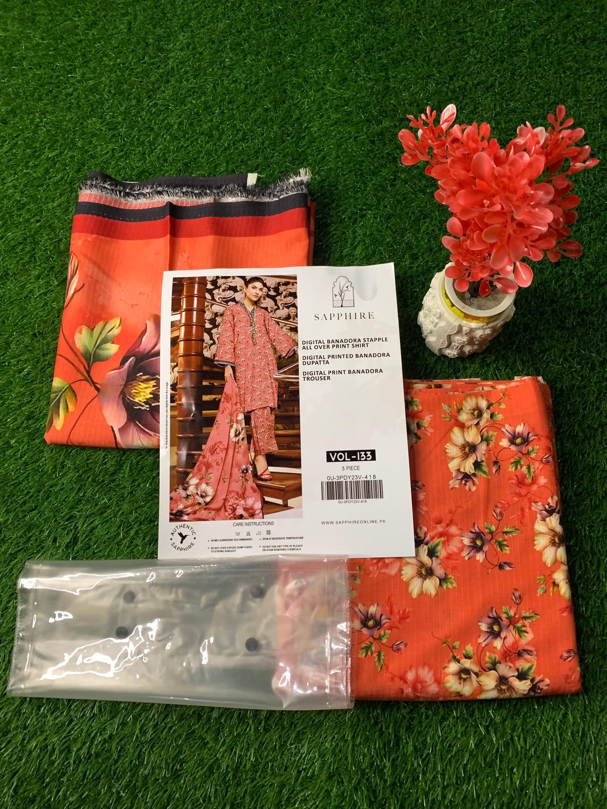This full 3-piece suit comes from the popular Vol-133 collection, featuring a soft pink base with bright floral accents that look fresh and stylish. The package gives you perfectly matched fabric for the shirt, dupatta, and trouser.