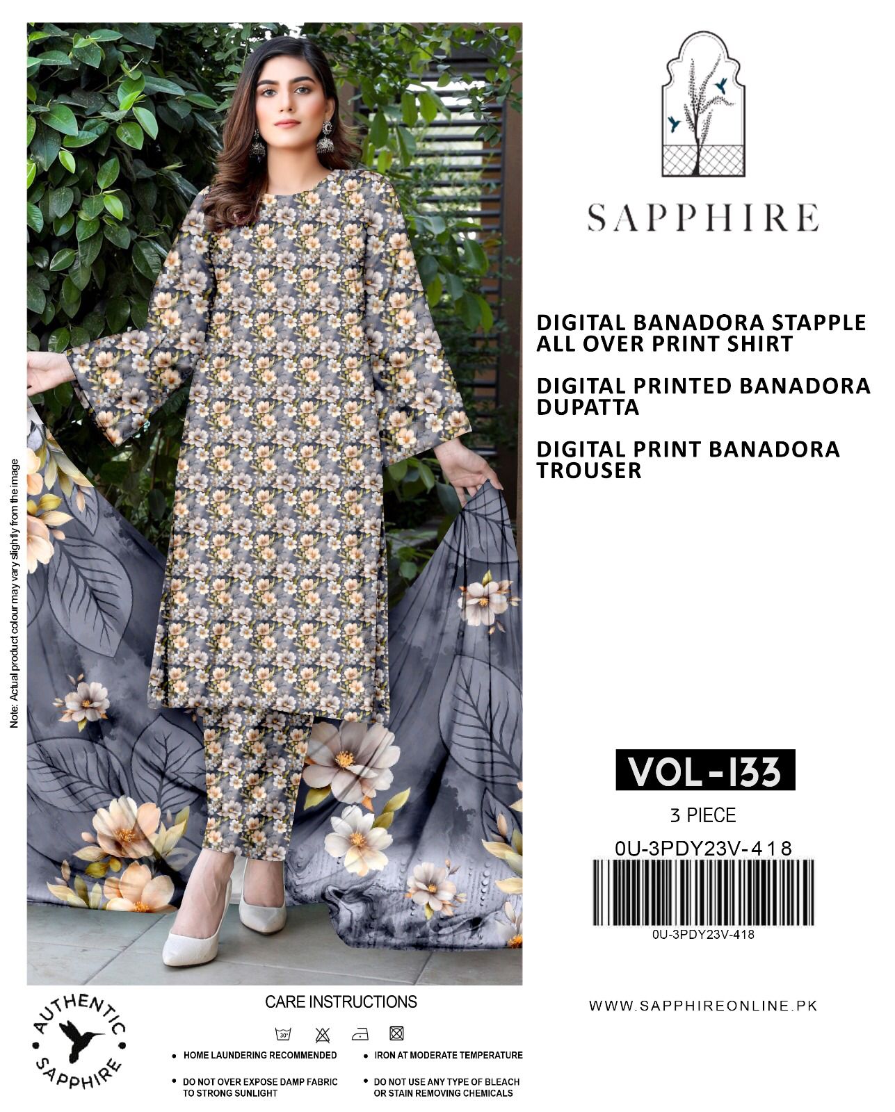 This suit has a tight all-over digital print with intricate mustard and white floral designs set across a neutral light grey base. The matching Digital Printed Banadora Dupatta features large, striking grey and soft mustard floral motifs on the end, giving the whole look a high-end, finished feel. This is an unstitched set, meaning you get the maximum value and total control over your final outfit design.