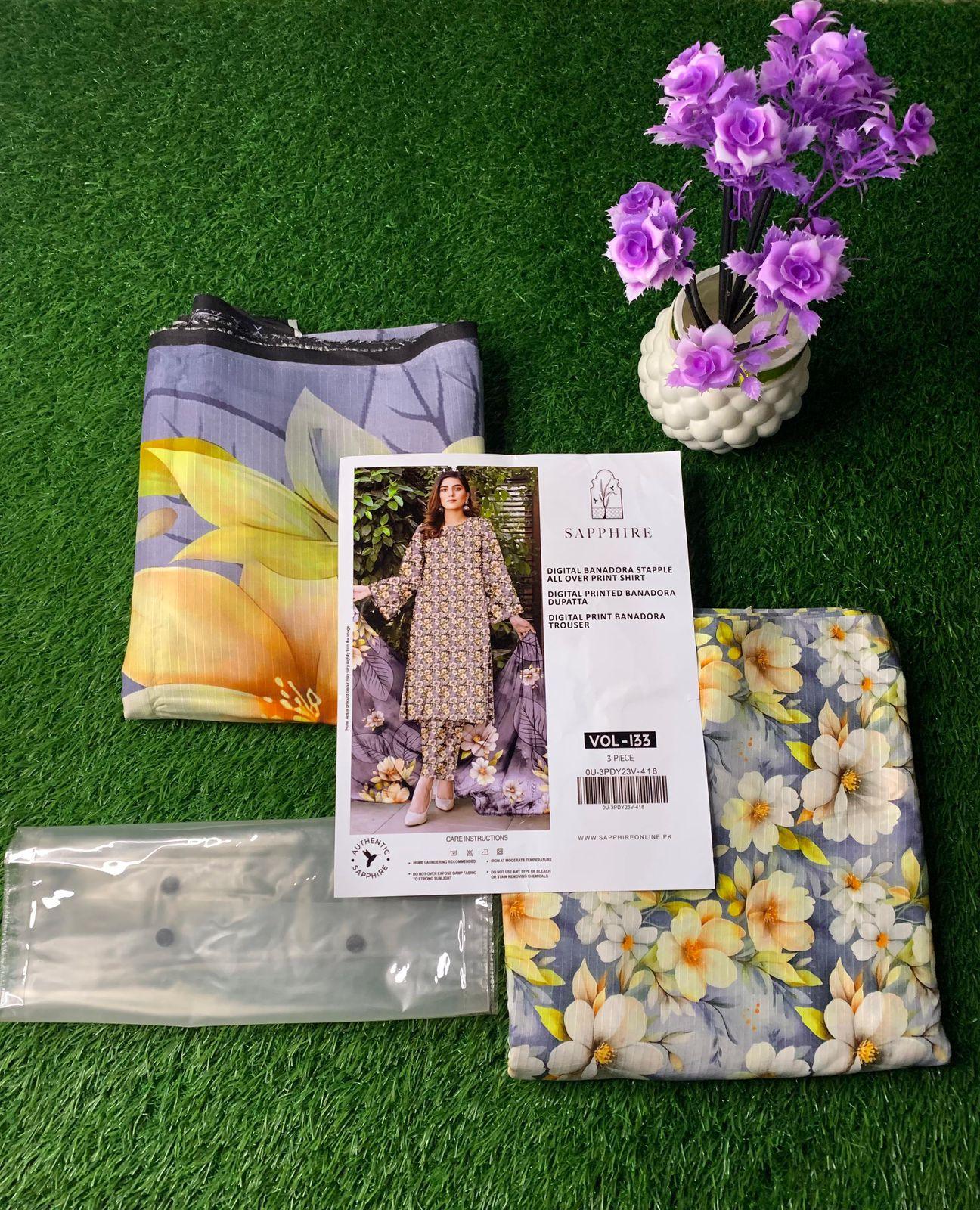 This suit has a tight all-over digital print with intricate mustard and white floral designs set across a neutral light grey base. The matching Digital Printed Banadora Dupatta features large, striking grey and soft mustard floral motifs on the end, giving the whole look a high-end, finished feel. This is an unstitched set, meaning you get the maximum value and total control over your final outfit design.